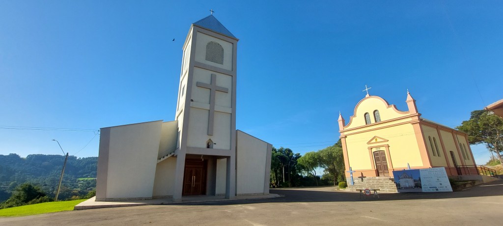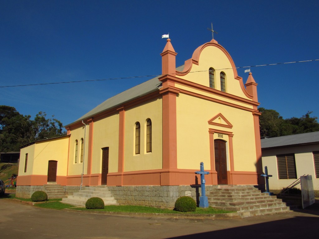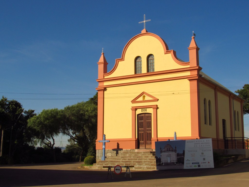 O carinho da comunidade com o seu patrimônio, no entanto fica claro no processo de restauração por que tem passado a Capela Santo Antônio de Castro erguida em 1916. Com linhas que remetem às construções conduzidas por padres jesuítas, ele está como nova por fora. Desta vez não conseguimos entrar pra verificar os trabalhos, que seguem sendo realizados neste outono de 2023, mas ainda falaremos com quem está realizando esta importante tarefa… Ao lado dela já há outra igreja mais moderna, que atualmente é utilizada pela comunidade nas suas celebrações religiosas.