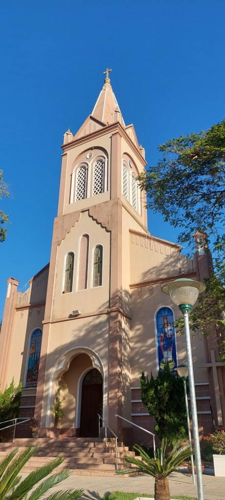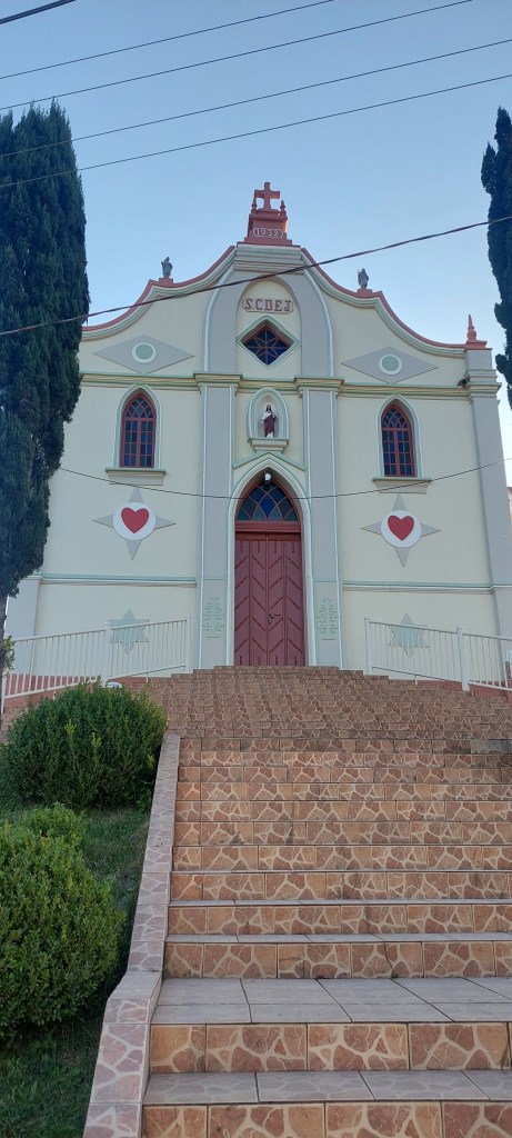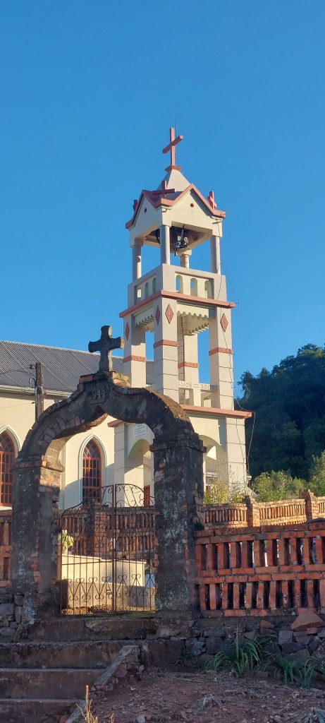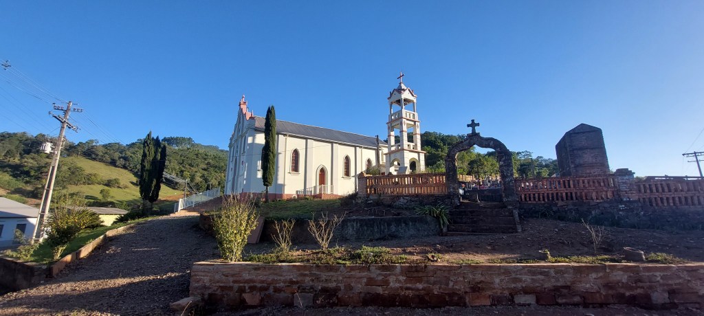 Tínhamos a intenção de ir a duas cascatas, mas ficamos somente com uma, pelo avançado da hora. Até por que tivemos que parar em mais uma bela igreja, esta católica com linhas um tanto originais… Em Alta Forquetinha, o templo de 1932 fica perto da cascata e a 7 km do centro e além de bem conservado tem a companhia de um campanário e de mais um cemitério. E com direito, é claro a magnífica paisagem do entorno…