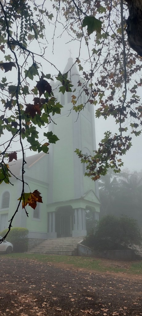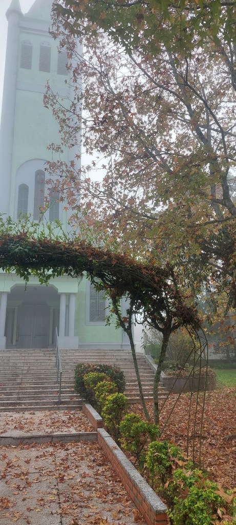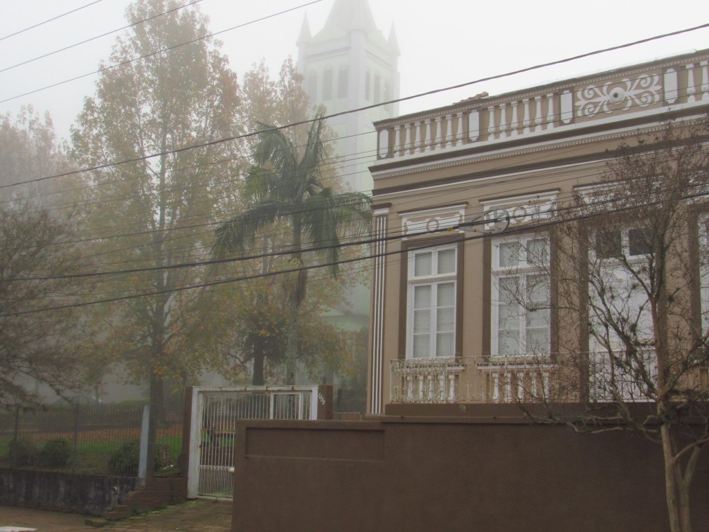 De manhã cedo tinha uma forte cerração, ou neblina como se fala em outras regiões… E o jeito foi pegar imagens com este clima diferente, entendo suas nuances e possibilidades. Foi assim na Igreja Luterana e na igreja Católica, ambas acompanhadas dos simbólicos plátanos da Rota Romântica, roteiro que Novo Hamburgo faz parte…
