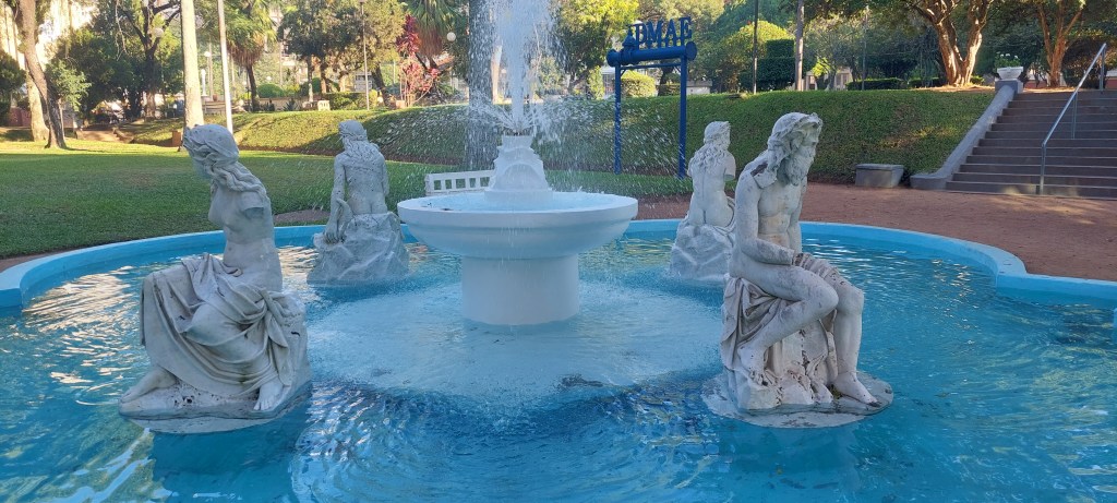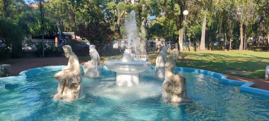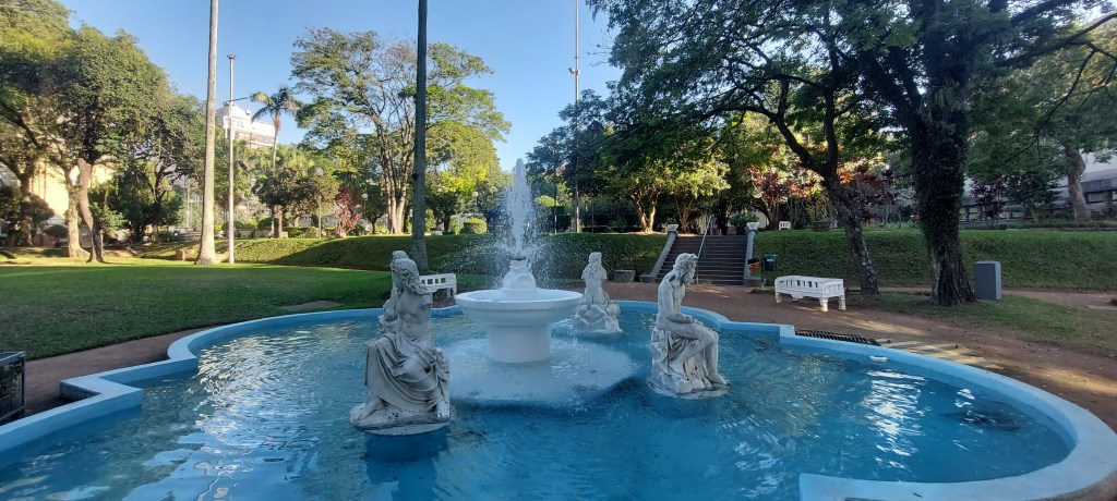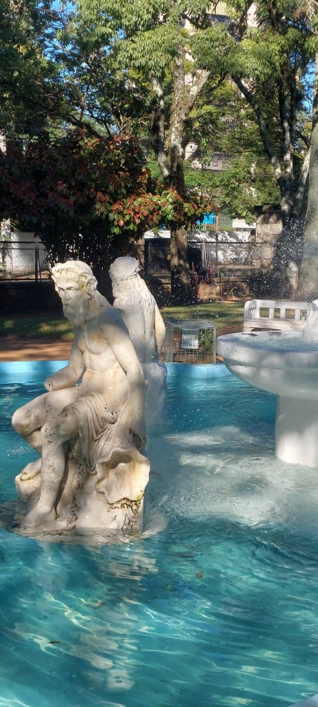 E um de seus recantos emblemáticos é onde fica o chafariz dos Afluentes do Guaíba, que está ali desde 2014, mas possui uma longa trajetória que começa com sua instalação na Praça da Matriz m 1866. Lá ficou até ser substituído e esquecido em um depósito, a partir de 1907, quando no lugar passa a ser erguido o monumento a Júlio de Castilhos… Com notícia de que um marmorista pretendia aproveitar seu mármore para outros usos, uma campanha do jornal Correio do Povo exigiu a sua preservação. E as quatro estátuas que representam os Rios Sinos e Caí, com Ninfas e Gravataí e Jacuí, com Netunos foram parar em cascatinhas da Praça Dom Sebastião, nas proximidades do Colégio Rosário. Já nessa época, estava “sumida” a figura central de um menino que representaria o Lago Guaíba…
