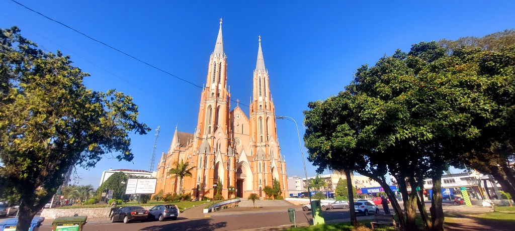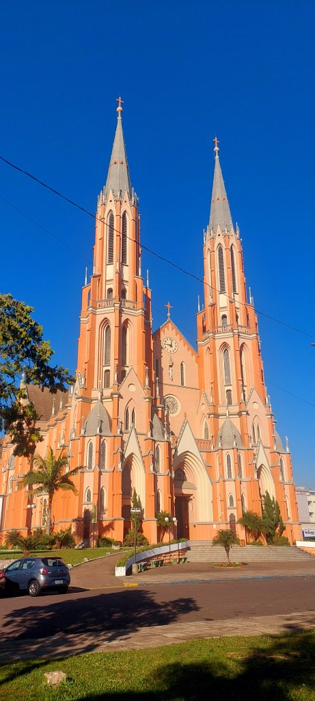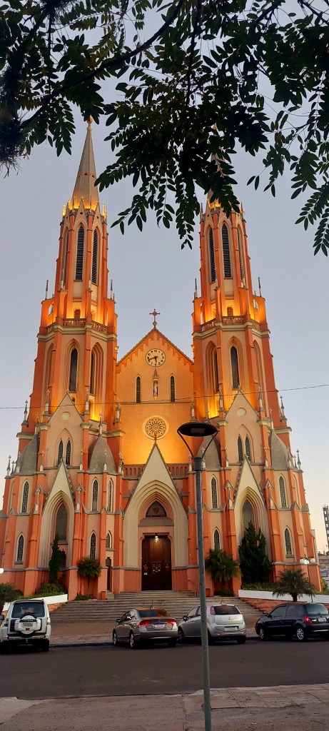 O templo como quase sempre acontece possui vitrais magníficos, chamando a atenção os imponente atrás do altar, que retratam cenas da expulsão de Adão e Eva do paraíso, e da crucificação de Jesus. Sempre constituídas de figuras humanas bem desenhadas e muito expressivas… A praça na frente possui referências ao chimarrão, pois a cidade é conhecida como a capital desta típica bebida dos gaúchos, e compõe um belo cenário com a igreja, incluindo o acender das luzes no começo da noite…