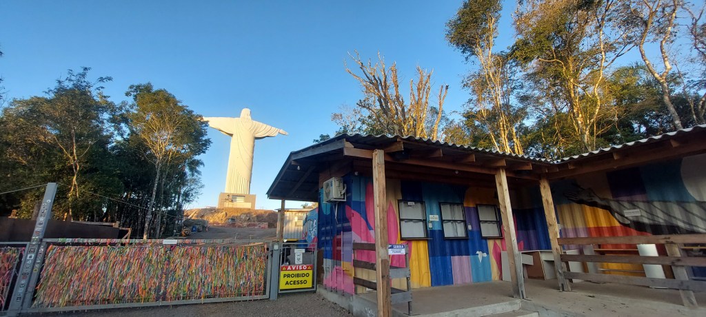 E é nessa cidade que subimos uma elevação para chegar perto da gigantesca estátua, que já está praticamente pronta. Afinal ainda estão sendo executadas, obras na sua base apesar de o corpo em si já estar abençoando o belo vale lá embaixo… Chegamos ali em um ensolarado final de tarde de inverno para poder apreciar a vista da cidade de Encantado aos nossos pés e o cristo a alguns metros de distância. Na seqüência fomos um pouco mais perto junto ao portão de entrada para poder ver sua grandiosidade de costas. As visitas com cobrança de entrada estão acontecendo apenas nos finais de semana. Por isso, na terça-feira que fomos, ficamos somente com as imagens a partir do portão de entrada, podendo ver que além das obras, já existe um pequeno comércio de lembranças da atração…