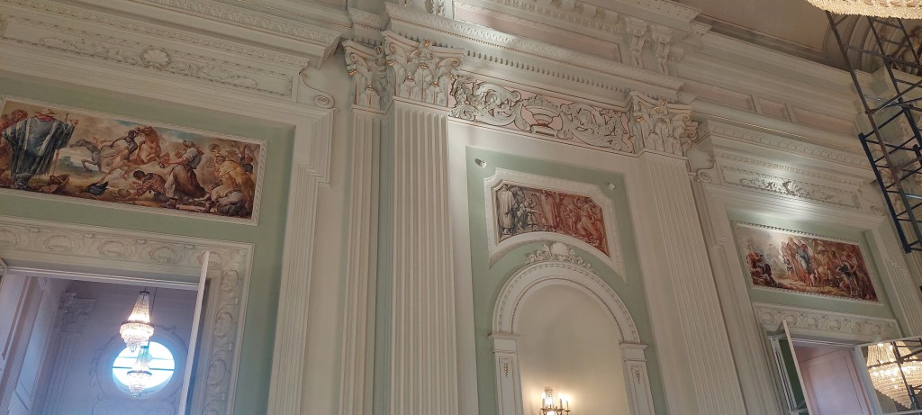 Neste sábado memorável, algumas salas estiveram abertas para deleite dos que perceberam que temos um tesouro ao nosso alcance. Em meio a alguns andaimes, se pode perceber o belo conjunto de pinturas do Salão Negrinho do Pastoreio. O nome faz alusão à história de um jovem escravizado que teria sido castigado por seu dono por ter perdido algumas cabeças de gado no campo. Ao morrer em cima de um formigueiro, o jovem teria ressuscitado ao lado de Nossa Senhora para espanto do estancieiro, em uma das versões da famosa lenda. E o ambiente envolvendo este episódio contado nos mais diversos rincões da nossa terra, e que gerou devoção popular a este mártir gaudério, está devidamente retratada em vários painéis pintados por Aldo Locatelli.