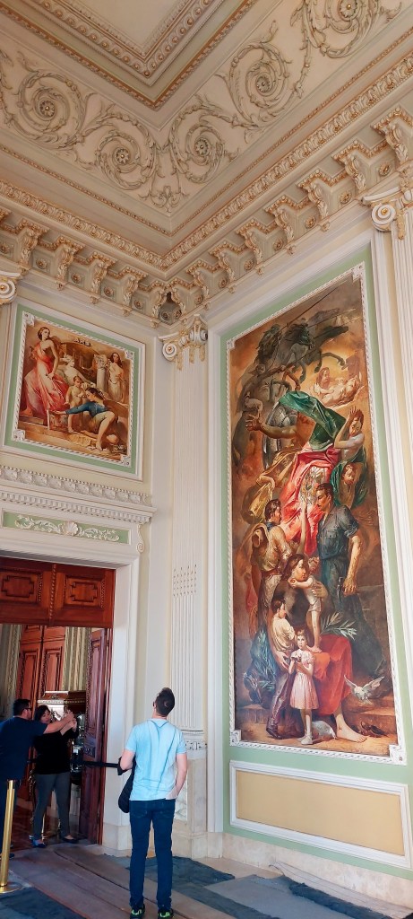 Na ante-sala do gabinete do governador há mais detalhes riquíssimos nas paredes, com um revestimento praticamente novo. E é claro que tem mais painéis do famoso pintor, incluindo um onde a família gaúcha é retratada, mas também a figura do homem do campo e do homem da indústria se cumprimentando… Uma cena de cavaleiros em guerra completa a obra, lembrando das revoluções que causaram sofrimento, mas que de certa forma contribuíram para o que somos hoje…