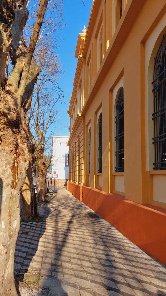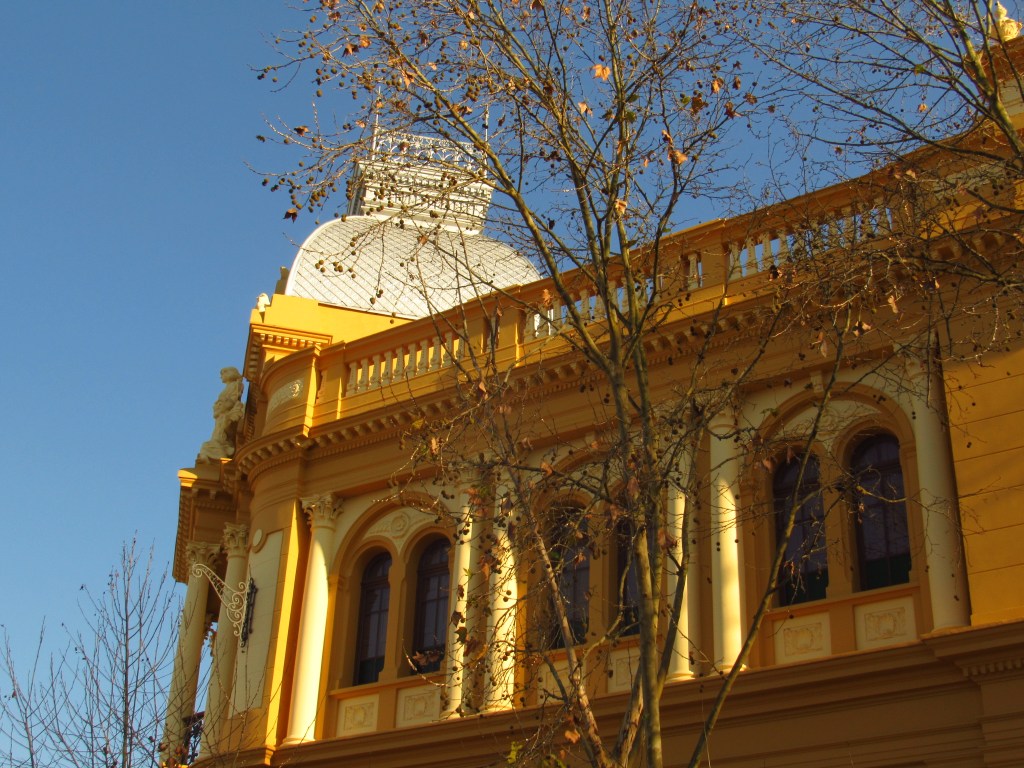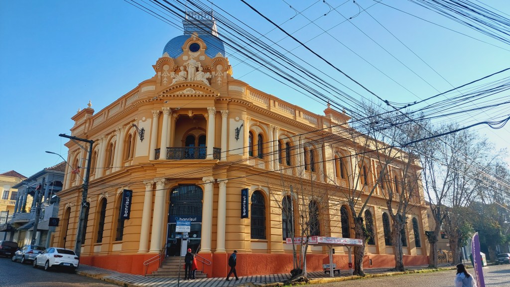 O grande destaque desta leva recente de restaurações, é sem dúvida o lugar que já foi sede do Banco Pelotense e que hoje abriga o Banco do Estado do Rio Grande do Sul. Construído em 1922, ele brilha com uma pintura em tons marcantes e belíssimos. Os detalhes de sua fachada agora podem ser devidamente apreciados, principalmente as estátuas lá no alto que representam a Indústria, o Comércio e a Agricultura. Além de sua imponente cúpula prateada reluzindo no sol da manhã… Os plátanos em uma das ruas da esquina onde está localizado ajudam a compor um cenário inspirador…