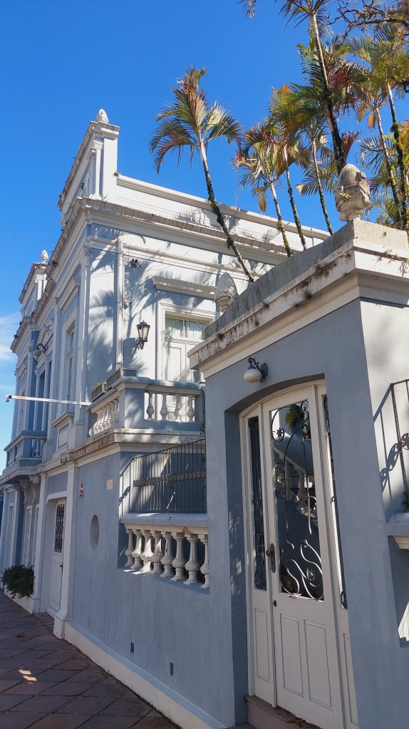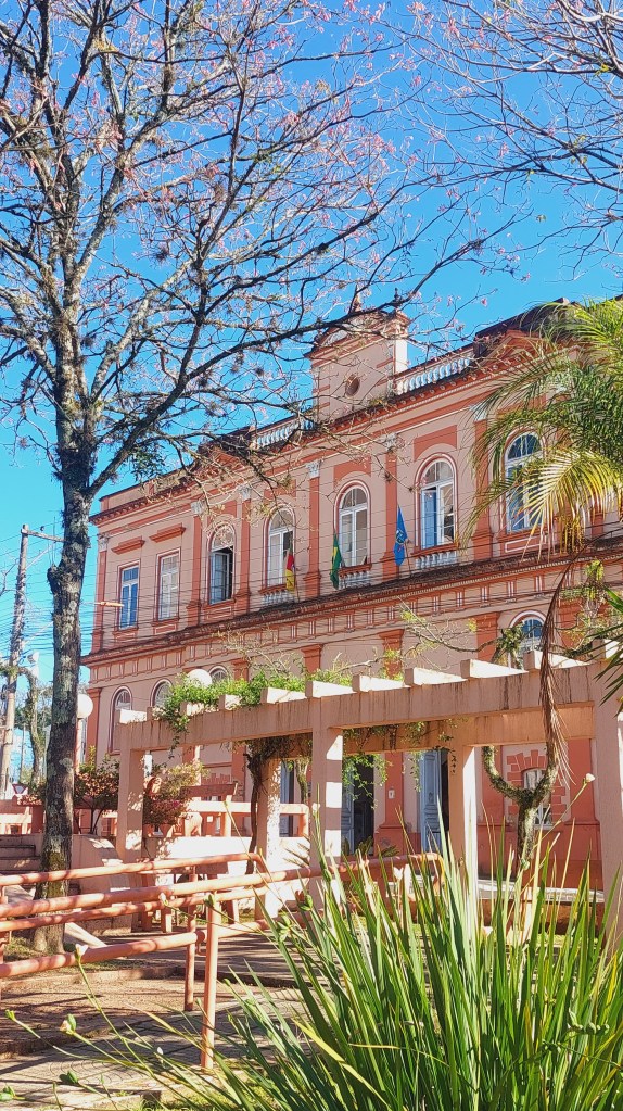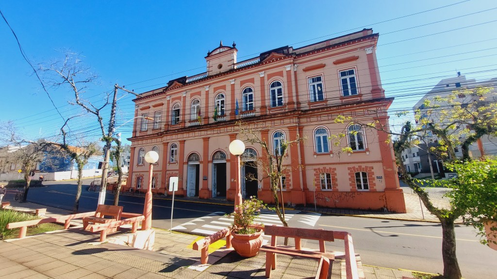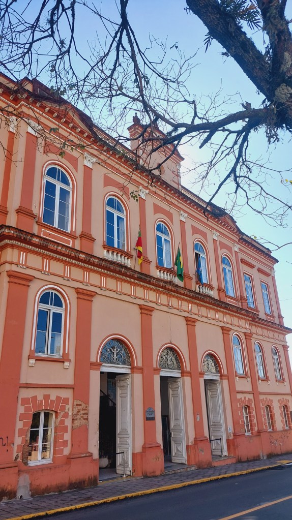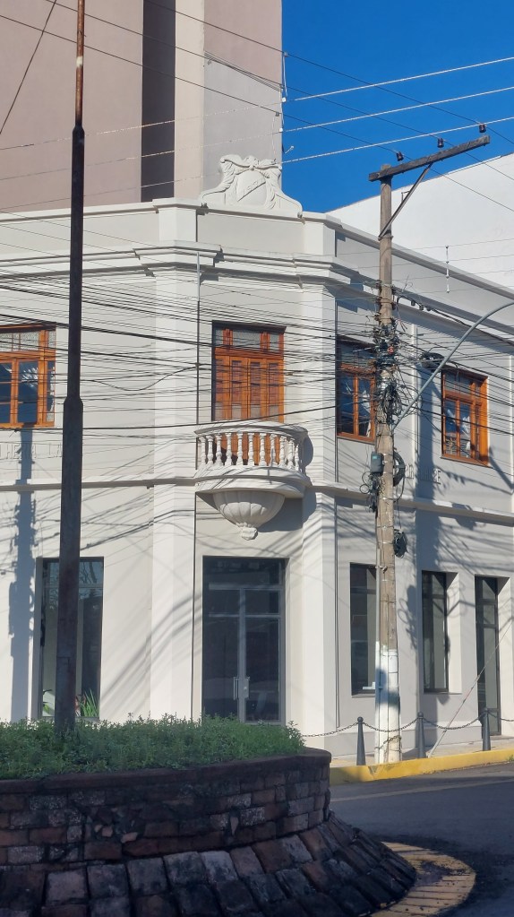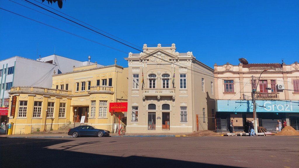 Mas quem centraliza de certa forma todo este patrimônio é o centenário prédio onde fica a prefeitura. O Palácio Diniz Martins Rangel, construído em 1908 faz homenagem a um prefeito que teria governado a cidade por 20 anos. Foi ele o proponente da estrada de ferro que ligaria Novo Hamburgo à Taquara, e também da criação dos distritos de Três Coroas, Parobé e Gramado, hoje prósperos municípios vizinhos… Também em frente à praça central da cidade, estão os prédios do então Banco da Província inaugurado em 1918, e o Club Commercial ali ao lado, que mantém esta grafia na sua fachada…